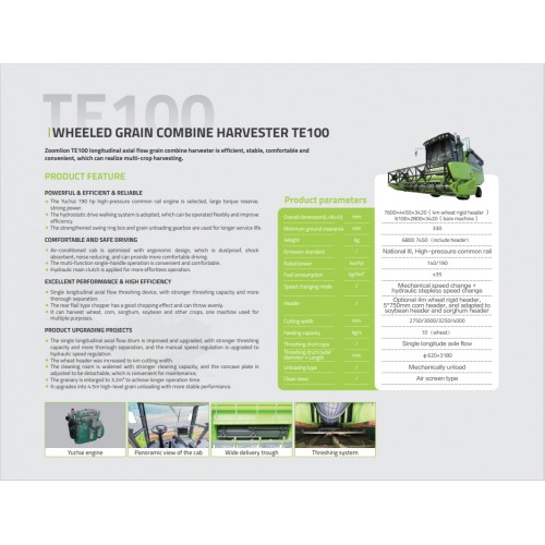 The Zoomlion TE100 longitudinal axial flow grain combine harvester is efficient, stable, comfortable and convenient, which can realize multi-crop harvesting.