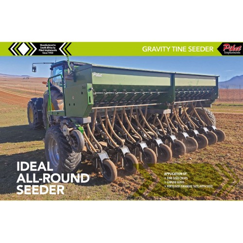Conservation Agriculture is a farming system that aims to preserve and improve the soil by implementing no tillage planting, crop rotation and cover crops. Farm equipment must be able to handle uncultivated soil and crop residues. The Piket Gravity Tine Seeder was designed for this purpose. The demand for this seeder comes mainly from the commercial farm where a general seeder is needed to sow a variety of seed. It is very popular where different types of grass, small grain and lucerne are planted for grazing. For medium size farms this is the ideal all-round seeder for wheat, oats, grass, canola, soya beans, etc.